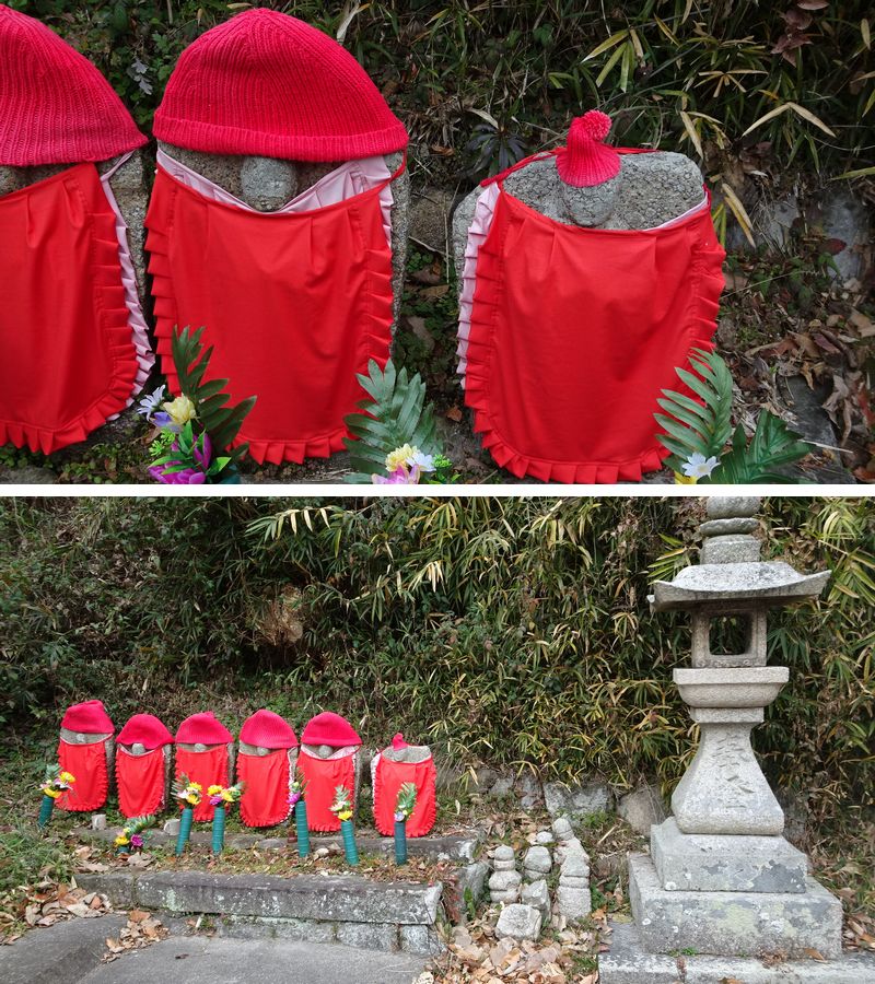 六地蔵横の灯篭には文久(1804年から1818年)の年号が読み取れます。 200年余太山寺へ通じる路で人々を見守るお地蔵様。右端の頭巾も小さく作られています。 ('25/02/04)