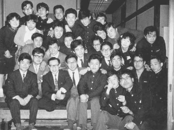 追い出しコンパ 私が1年の時のコンパである。2年生とは口がきけたが、3年生やまして4年生ともなると普段は会室でもお目にかからず、その数の多さに圧倒された。特に新聞会では、8年生まで揃っており年齢不詳のメンバーが勢揃いし圧巻であった。(お)