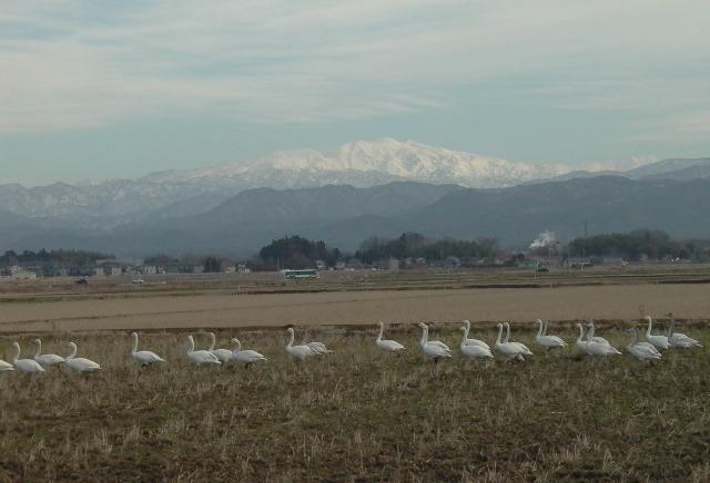 柴山潟の白鳥 成人の日、北陸地方は久々の快晴。白山もすばらしい眺めでした。加賀市の柴山潟近くで、白鳥が湖から上がって、刈田で小魚か巻き貝を漁っていました。カメラをもって近づくと、列をなして逃げてゆきました。 (04年1月10日、加賀市動橋付近で、清水一與撮影)