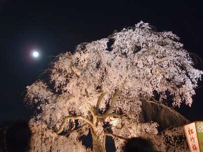 関西桜だよりC桜行脚 5日は満月、「♪月はおぼろに東山…花もいざよう紅桜」の写真を撮りに 円山公園へ。7時半に東山から月が紅シダレ桜の左上に昇った。やはり優雅だ。だらりの帯の感じ(暢)