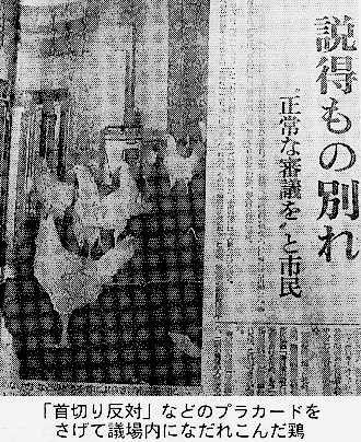 「コココ、コケッコー」時ならぬ“鬨の声”が聞こえだした。ここは養鶏場ではない。神聖なる北九州市議会議事堂・本会議場だ。議員もあっけにとられている。あわてて事務員数人が飛び出して鶏を必死に追いかけるが、悲鳴を上げながら議長席を中心に逃げ回る。その数四十数羽。首に「首切り反対」「私の首を絞めないで」「谷市政打倒」などと書いた札をぶら下げている。まさに“こっ鶏”な風景である。全部“逮捕”するまでに二十分以上かかったが、鶏糞が散らかり、それを掃除するのにまた時間をついやした。