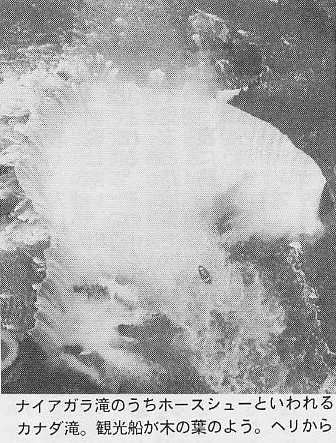車で一時間半南へ走るとナイアガラ。日本では仕掛け花火の終わりを飾るのがこの滝。それを目の当たりにすると、なるほど大迫力。船で近づくと、六〇メートルから落ちるしぶきと風で台風の中にはいったよう。カッパを着ていてもズボンの下やくつはびしょぬれに。さらにエレベータで下りて、トンネルを抜け、真横から、真後ろからも見れる。