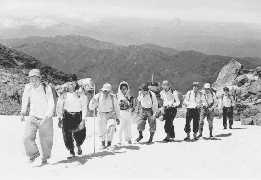 白山へ挑戦 岩間温泉/山崎旅館前 鈴木先生 「白山に挑戦」を見ていろいろ思い出す。草鹿は痔が悪くジシンをなくして不参加。そもそも標高2702bの白山・弥陀ヶ原でソフトボールをしたのは白門チーム以外世界的にもいないギネスものだろう。ハイマツの枯れ枝でボールを打った。空気が軽いので良く飛んだ。が、気圧が低く、80度で沸騰してしまい飯ごうの メシは半煮えだったがうまかった。
