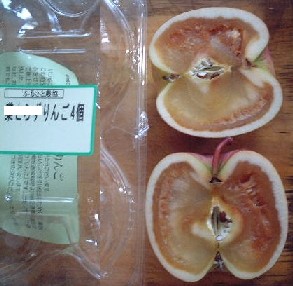 ●協同購入の商品のりんごが、見事に腐っていました。左の画像ですが、デジカメに撮り今日の宅配の時につれあいが業者に見せました。いかにも苦情を言っているようで見せるのは嫌やと渋っていたのですが、業者は実態がわからないとこちらが疑われるし、本部からさらに流通業者や生産者へクレームがいいにくいし、向こうも役立つはずとプリントして渡しておいたのです。業者さんによると「今回は腐っているというクレームがあちこちからあった。ぜひ写真が欲しいと」いわれたとか。4個のりんごのうち、2個は食べられたのですが、4個分返金していただけました。