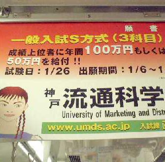 ● 成績優秀者を確保するために優待生制度を行っている大学もありますが、電車のつり革で見かけたこの画像は、より「わかりやすく」入試方法を説明しています。本来は大学の特色をアピールするウリよりも、金銭的な負担減が効果的ということでしょうか。成績下位者が上位者に金を支払う図式に見えるけど、これで志願者が増加するのかどうか他所ごとながら気になります。('03/01/9撮影)