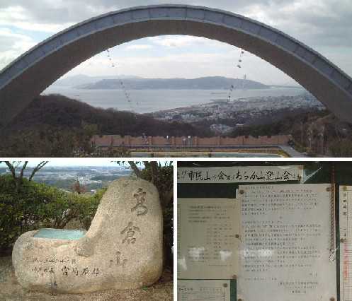散策路を結構熟年の方々が歩いていて元気そのもの。山頂が近づくにつれすれ違う時の挨拶の頻度も増えていきます。登山会が結成されており毎朝山登りする方の出席表が貼ってありました。高倉山の石碑には、「ポーアイ建設の時に山を削り埋め立てをした。気象状況の環境変化と景観を配慮して209メートルの高さで抑えた」ことが記されています。近隣の人々の健康増進と交流に使われ賢明な選択でした。('03/01/25撮影)