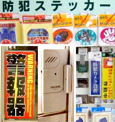 ● 我が家も心配になりドアの専門コーナーに出かけました。空き巣狙いはその気になればいくらでも物件はあるので、入りにくい鍵の家や、警戒をしていると思われる家はパスして、他の入りやすい家に回るとか。 コーナーには、鍵以外にもステッカーなどの防犯関係のグッズがずらり。さっそく窓の警報装置をつけました。裏には「警報器」と表から分かるようなラベルがあり、セットすると、ガラスの振動や移動に反応し強烈な音声が鳴ります。これでも気休めなんでしょうが。