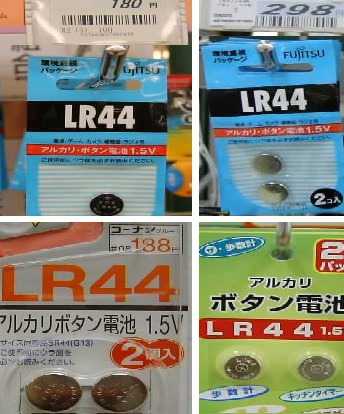 LR44のボタン電池が必要になって量販店に行きました。今回紹介するのはここまで開くケースは珍しい例です。上段と下段左はいずれもfujitsuの商品。単価計算をすると1個あたり186円、180円、94円という値段の開きがあります。しかし驚くのは、ダ○ソーの50円×2個。これは中国製とありますがこ商品イメージと関係なく100円ショップの使い捨てで充分な気がします。