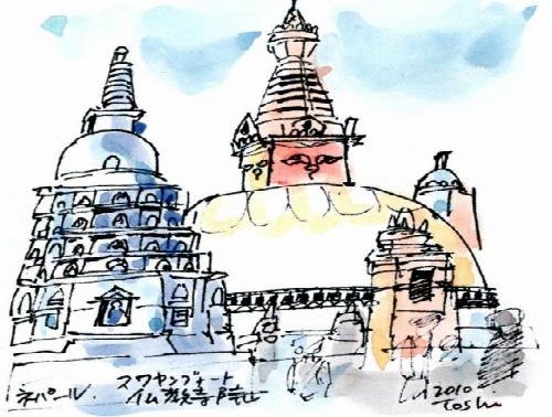 新年明けましておめでとうございます。今年の賀状には、スワヤンブナート寺院を描きました。モンキーテンプルともいわれ、猿が多くいます。仏塔の周囲にはチベット仏教の特徴であるマニ車があり、時計回りに回しながら巡ります。