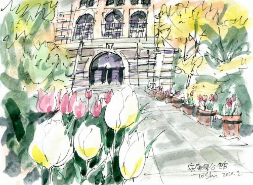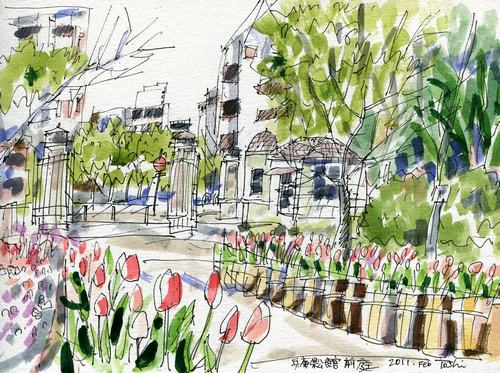 地下鉄に乗って県庁界隈を通ることがよくあり、時間的な余裕があると県公館の庭を通るのでスケッチの素材としてもよく描きます。1年前と同じくこの時期、チューリップの球根に休眠から覚める処理をして花をつけさせたチューリップが並んでいます。
