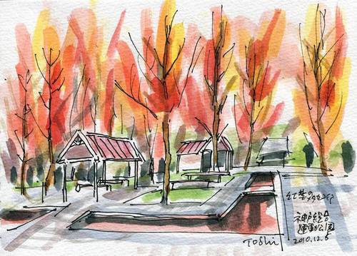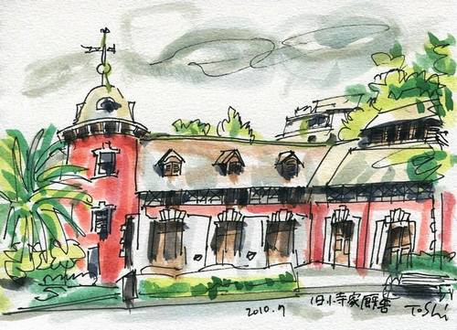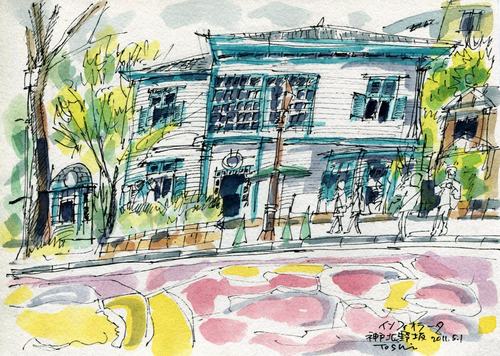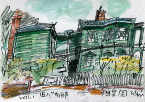 この時期、兵庫県庁北側の相楽園で菊花展が催され、園内にある旧ハッサム邸の内部も一般公開されています。ここはよくスケッチの素材にしますが西側のアングルから今回は描きました。
