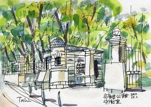 兵庫県公館はスケッチポイントとしてよく描きますが正門西側にある「守衛室」もなかなかいい雰囲気があり本館の名脇役になっています。