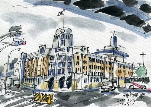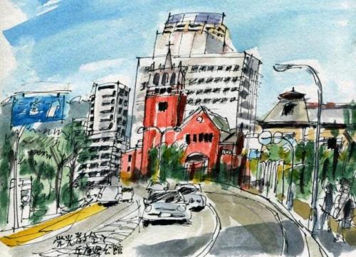 地下鉄“県庁前”から地上に出ると目に飛び込む栄光教会です。よくスケッチに描く素材ですが、周りにビルが林立してきて、全景が見られるのは、西側に伸びる幹線道路のこの位置からしかありません。神戸淡路大震災で瓦解したこの教会が元通りに復元されたときは復興のシンボルとして注目されました。東日本大震災でもこのような象徴的な建造物の復興が果たされることを願っています。