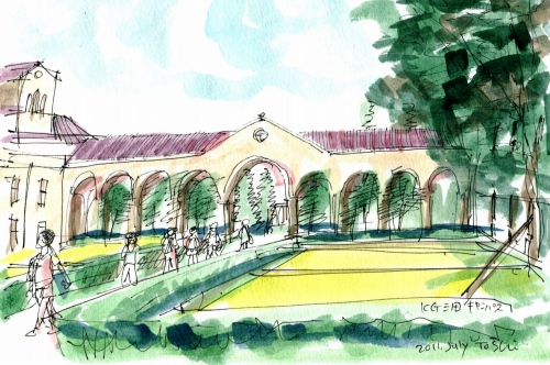 三田市にある関学の三田キャンバスです。ここには理工学部と総合政策学部があり、上ヶ原と同じスペイン風の学舎で、自然に恵まれた環境です。ここも暑くなってきました。