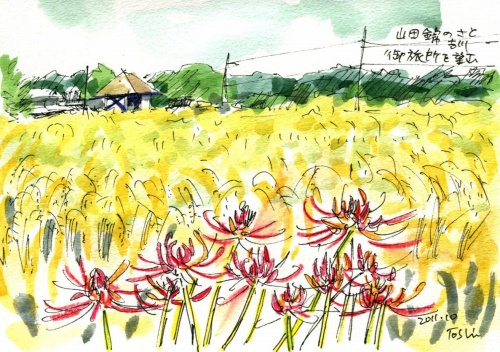 週1回出かける途中の沿線風景です。今は三木市の吉川地区は稲刈りの時期で黄金色の稲穂と彼岸花の対比が美しい。山田錦の生育で知られています。遠くに見える茅葺の小屋は、若宮神社へ渡る神様の御旅所です。