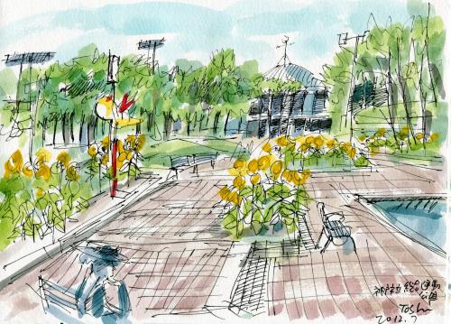 夏休みに入ると神戸市営地下鉄の総合運動公園界隈ではスポーツのイベントが目立ちます。暑さの中、ひまわりが目を引きます。