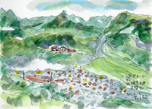 先月は奥穂高(3190m)へ登りました。涸沢ヒュッテに二泊しましたが山頂近くでは鎖場と岩場が続きます。涸沢ヒュッテから涸沢小屋と北穂高方面を望むと宝石のようにテントが点在しています。