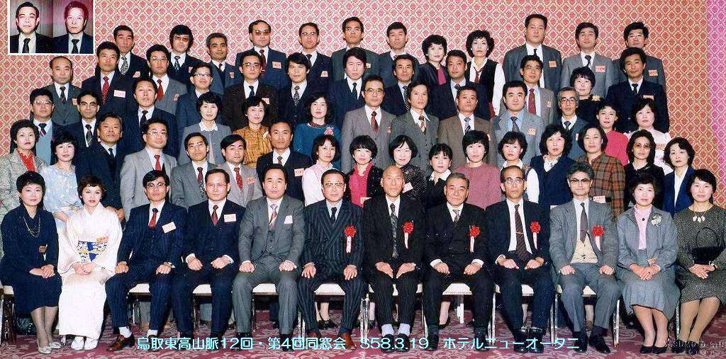 第4回(卒業22周年)同窓会 1983(昭和58年)3月19日、ホテルニューオータニ鳥取で開催。 画像の上にマウスを置き右クリック→名前をつけて保存で元の大きな画像がパソコン上に取り込まれます。 ディスプレイでは小さいですが 大きな皆さんの顔が識別できる大きさ になります。 まだまだ髪は黒々。